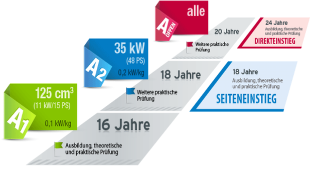 Krafträder (auch mit Beiwagen) mit einem Hubraum von mehr als 50 cm³ oder mit einer durch die Bauart bestimmten Höchstgeschwindigkeit von mehr als 45 km/h und dreirädrige Kraftfahrzeuge mit einer Leistung von mehr als 15 kW und dreirädrige Kraftfahrzeuge mit symmetrisch angeordneten Rädern und einem Hubraum von mehr als 50 cm³ bei Verbrennungsmotoren oder einer bauartbedingten Höchstgeschwindigkeit von mehr als 45 km/h und mit einer Leistung von mehr als 15 kW 20 Jahre & 2 Jahre Klasse A2 nur Aufstiegsprüfung